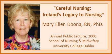 In 2000, Mary Ellen was invited to give the Annual Public Lecture at the School of Nursing and Midwifery, University College Dublin. She titled her lecture 'Careful Nursing: Ireland's Legacy to Nursing'. In it she linked the term 'careful nursing', which the 19th century Irish nurses used in a general sense to describe their practice in their letter written for the British War Office in 1854, with the system of nursing that they formulated over the early to middle years of the 19th century. Mary Ellen proposed that contemporary Irish nurses use this term as a proper noun to identify their forebears system of nursing.
