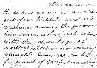 Attendance on the sick is, as you are aware, part of our Institute; and sad experience among the poor has convinced us that, even with the advantage of medical attendance, many valuable lives are lost for want of careful nursing.