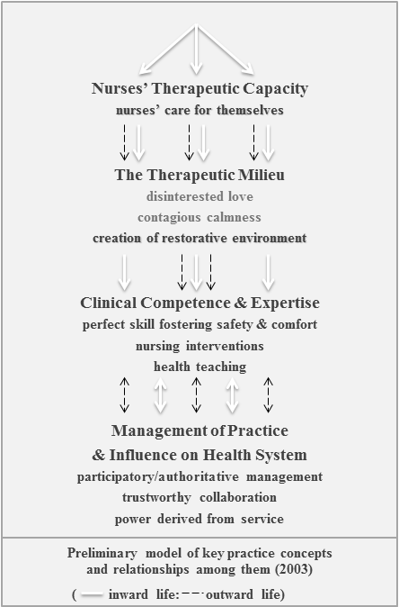 However manuscript reviewers, influenced by prevailing views of conceptual model development in nursing, insisted that these categories and subcategories be termed the other way around. They disregarded the philosophy and viewed the four categories as the main Careful Nursing concepts. Thus, the practice model was published this way in 2012, as referenced in previous CNN articles.