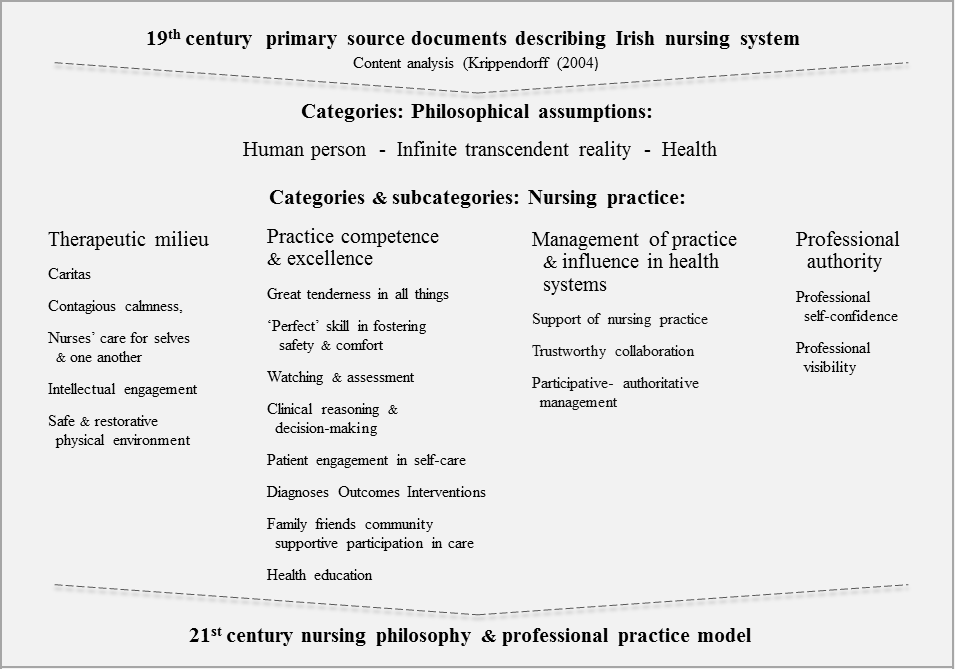 Descriptions of the early to mid-19th century Irish nurses' ideas and practice, written by themselves and by their observers, offered an obvious foundation for the construction of a contemporary conceptual model of nursing. Beginning in 2001, and with the support of fellowships from the Barbara Bates Center for the Study of the History of Nursing, University of Pennsylvania, USA, and the Eleanor Crowder Bjoring Center for Nursing Historical Inquiry, University of Virginia, USA, Therese Meehan conducted historical research necessary to identify and analyse the historical documents. These documents were then subject to content analysis and the resulting categories and subcategories were translated into concepts and dimensions of concepts. This process made it possible to construct the contemporary philosophy and model.