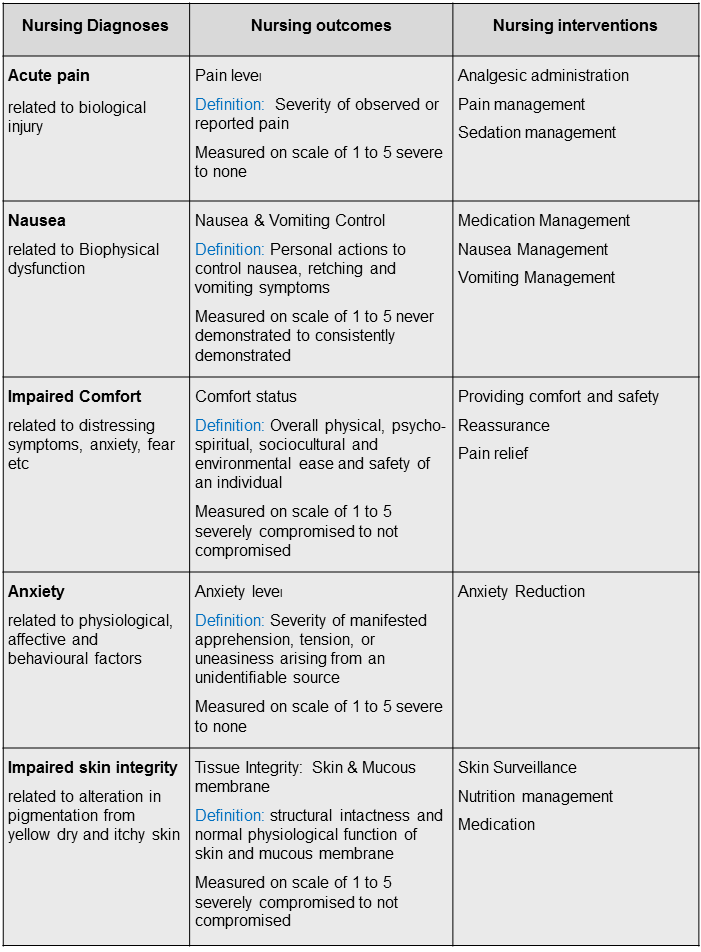 Once the nursing diagnoses are chosen, I continue following the steps of the nursing process to select the appropriate nursing outcomes and nursing interventions. I found NANDA, NOC, and NIC Linkages edited by Johnson et al (2006 ) to be a very useful reference, especially in validating the appropriate selection of outcomes and interventions according to the patient's needs. Most importantly, selected nursing outcomes are objective and can be measured on a five point Likert scale.