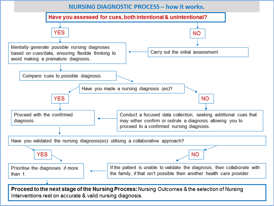 For her pre-operative care plan the nursing diagnostic process pathway described in Diagram below was as used (adapted from presentation on standardised nursing languages by Sinead Murphy and used with permission).