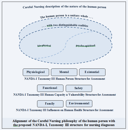 But, a realignment of Careful Nursing philosophy and these structures may soon be possible using the proposed NANDA-I Taxonomy III structure developed by von Krogh (Herdman, 2014). At the moment the new structure is still under consideration. But if it is adopted it would align more clearly with the Careful Nursing philosophy of the human person, as suggested in the following figure:
