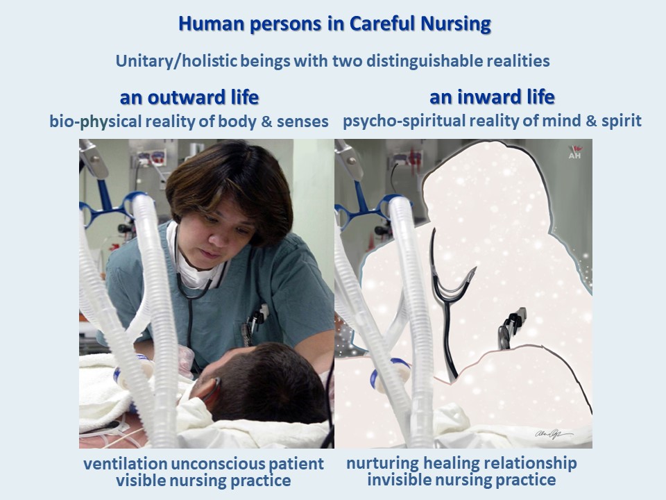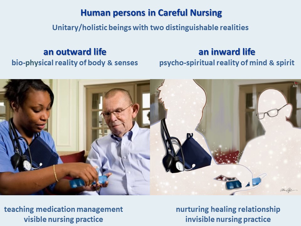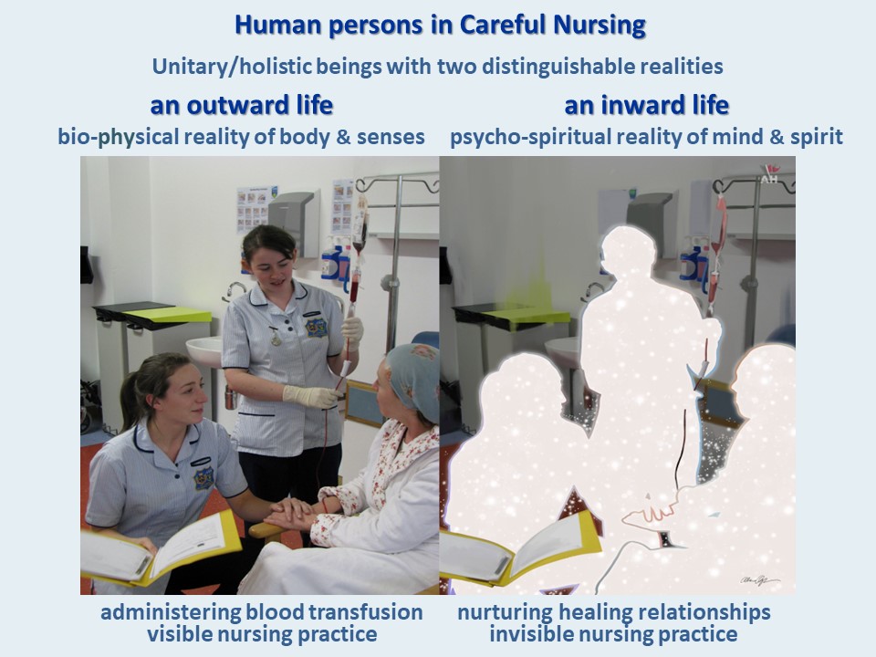 Aquinas offers Careful Nursing a subtle but practical answer to this question. He argues that while human persons are in essence holistic/unitary beings, they have two distinguishable realities; a bio-physical reality of body and senses – a visible outward life – and a psycho-spiritual reality of mind and spirit – and invisible inward life. These realities are not parts of persons but are realities which can be distinguished within the unitary whole (Aquinas 1265–1274/2007, I Q75, Art. 4; Q76; II Q23, Art.1).