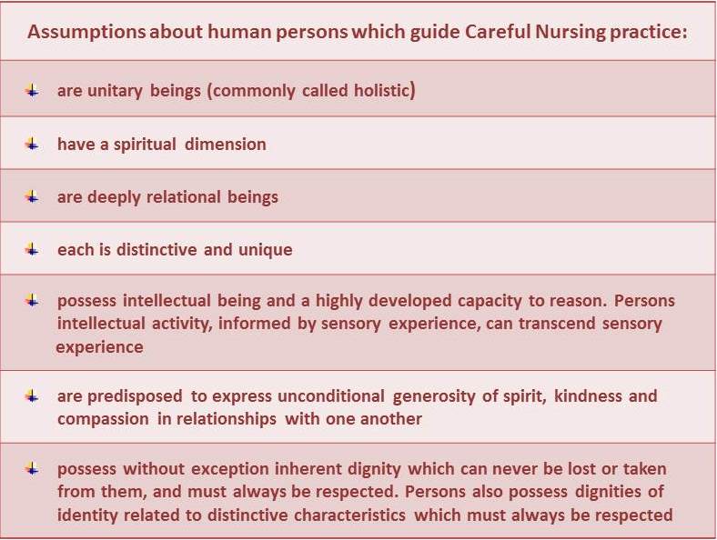 Careful Nursing uses the philosopy of Aquinas as the guide to the meaning of the term human person; on who human beings are as persons; on what it means to be a person. Person-centred care in Careful Nursing means using the assumptions outlined in the Table above as a basis for caring for sick, injured and vulnerable people and in all human interactions concerned with that care.
