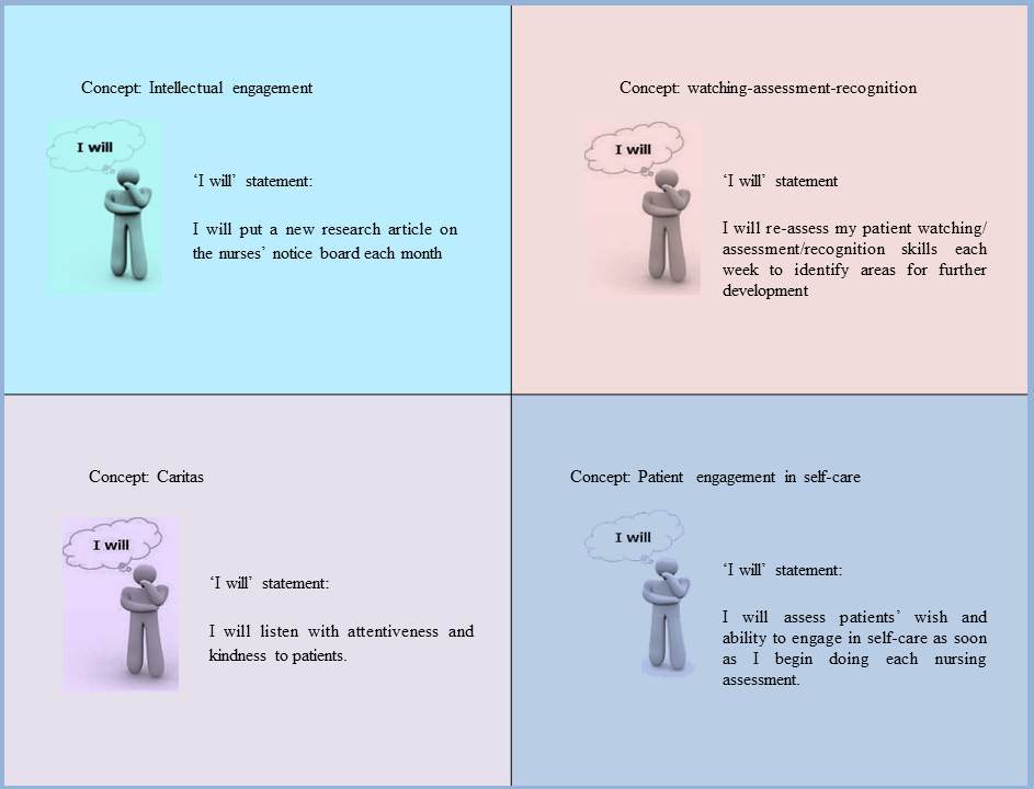 Using 'I will' statements originated with nurses at Mercy Hospital and Medical Center, Chicago, USA, When they first began learning about and implementing the preliminary model of Careful Nursing in 2006, they developed practical ways of transferring concepts into actions, one of which was developing 'I will' statements, that is, what they would actually do to implement each concept. To develop 'I will' statements the nurses worked together to think about and discuss each concept. Then for each concept, they agreed using their own words how they would express the concept in their practice attitudes and activities. They developed agreed upon attitudes and activities, or 'I will' statements for implementing each concept (Roemer 2006). They kept lists of their 'I will' statements in places such as on the backs of their name badges and on flip-cards for easy access and review at nurses-stations.