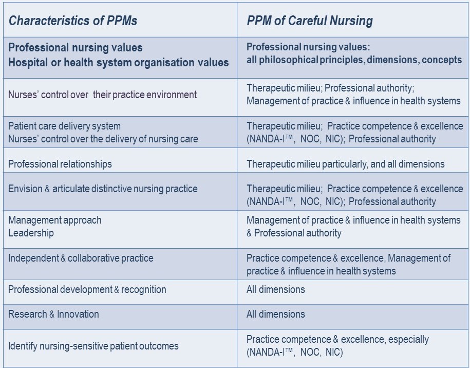 PPMs developed further with development of the Magnet Recognition Program®(American Nurses Credentialing Center (2014), widely recognised as a benchmark for excellent nursing practice. Thirty-eight published PPMs were identified and reviewed by Slatyer et al., in 2016, one of which was the Careful Nursing PPM.