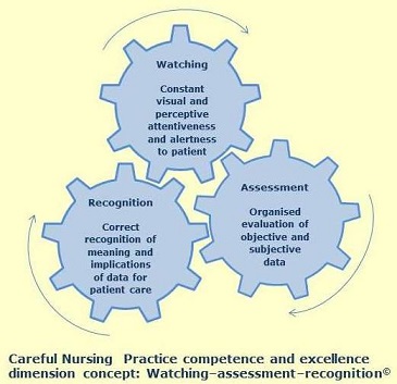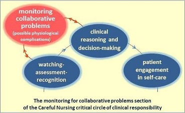 Watching-assessment-recognition is closely related to the following concept, clinical reasoning and decision-making, and serves as a 'first alert' or 'early warning' of potential or actual physiological instability in patients, addressed in Careful Nursing using the Carpenito (2017) concept of collaborative problems.