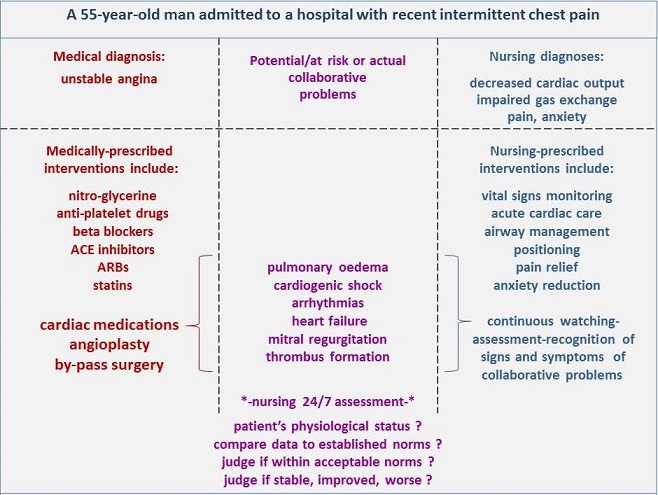 Physician-prescribed interventions may include medication or surgery. Nurses will watch for, assess and recognise the meaning of vital signs and other physiological indicators continuously. A related nursing diagnosis might be anxiety related to threat to health status, and nursing-prescribed interventions may include active listening or progressive muscle relaxation.