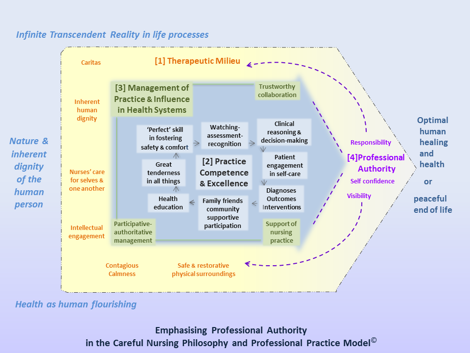 The diagram below shows professional authority circulating back into the other three practice model dimensions. Together with the other practice dimensions the diagram points to the overall outcome of implementing the philosophy and practice model, that is, optimal patient healing and health, or sometimes a peaceful end of life.