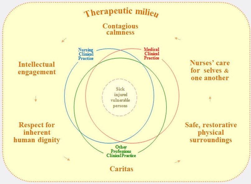 Naturally, all healthcare personnel in a given ward or unit contribute to its quality, but its quality is primarily created and sustained by professional nurses in co-operation with their care assistants and other assistive personnel; other health professionals come and go but nurses, in their 24/7 relational continuity with patients, are always present. The Therapeutic Milieu provides the co-operative healing context within which all multidisciplinary care takes place, as illustrated in the following diagram: