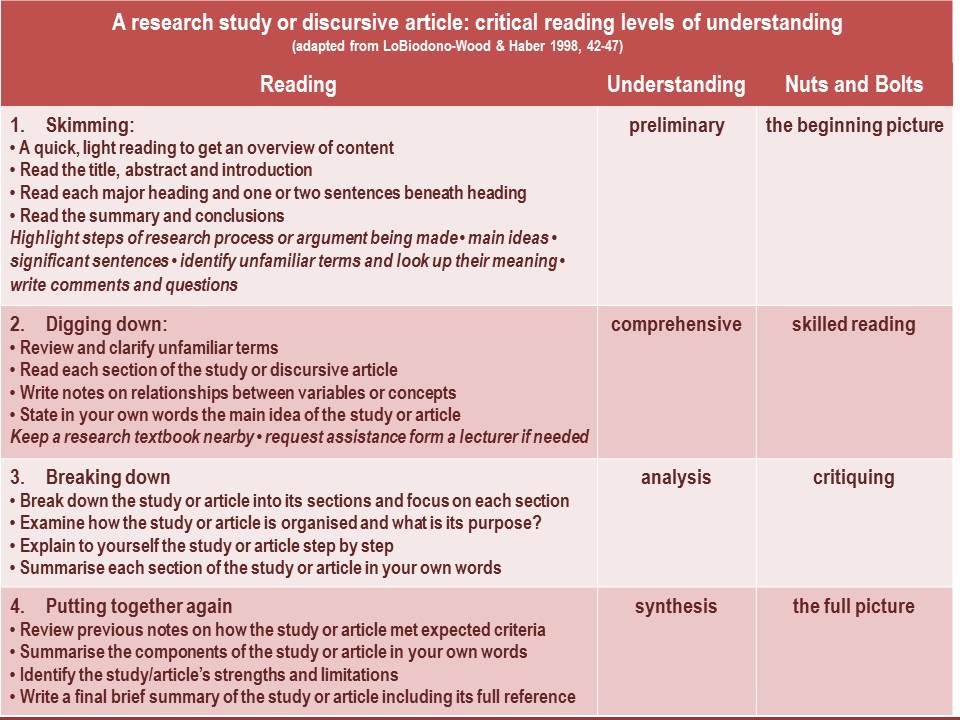 LoBiondo-Wood and Haber (1998) also present and discuss a four-level strategy for critically reading and understanding research reports. These four levels of reading and understanding can be used for any professional article, whether it is a research report or a discussion and analysis of a theory, framework, concept or procedure.