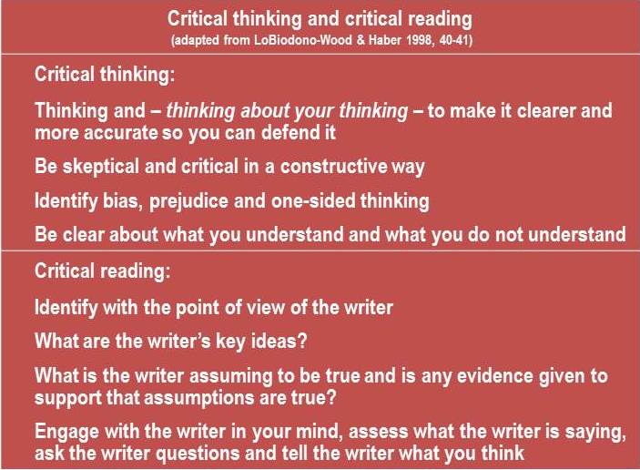 To begin with, earlier editions of the LoBiondo-Wood and Haber book may be most useful for getting a grip on how to read and understand research and other nursing articles. In earlier editions, for example, Nursing Research: Methods, Critical Appraisal, and Utilization, LoBiondo-Wood and Haber (1998), these authors discuss the nature of critical thinking and critical reading; they suggest a practical and engaging approach to intellectual engagement. You are encouraged to read the original (pp. 40-41), a summary of which is shown in the following Table.
