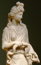 For example, in ancient Greek mythology the goddess Hygieia is identified as a goddess of nursing. Hygieia symbolically personifies nursing attitudes and activities such as calmness, kindness, tenderness and healing. She is addressed in the Orphic Hymns as Hygieia of the gentle hands, implying that her hands have a special therapeutic quality. Hygieia was viewed as a bearer of life's transforming power and a compassionate friend of humankind. She is often portrayed in a harmonious relationship with a serpent which she is feeding and which symbolises life's rhythmic flow, its power of self-renewal and continuous transformation. In feeding the serpent she symbolises the nourishment of the flow of life. Hygieia personifies goodness in nursing and the fostering of healing and health in the community (Cooper 1978, Wroth 1984).